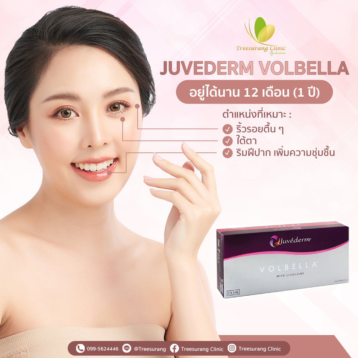 • Juvederm Volbella เป็นฟิลเลอร์เนื้อนิ่ม มีโมเลกุลขนาดเล็กที่มีความละเอียดมากที่สุด เหมาะสำหรับการเติมใต้ตา หน้าผากปาก ริมฝีปาก มีความเป็นธรรมชาติ ไม่เป็นก้อน ผลลัพธ์อยู่นานประมาณ 8-12 เดือน