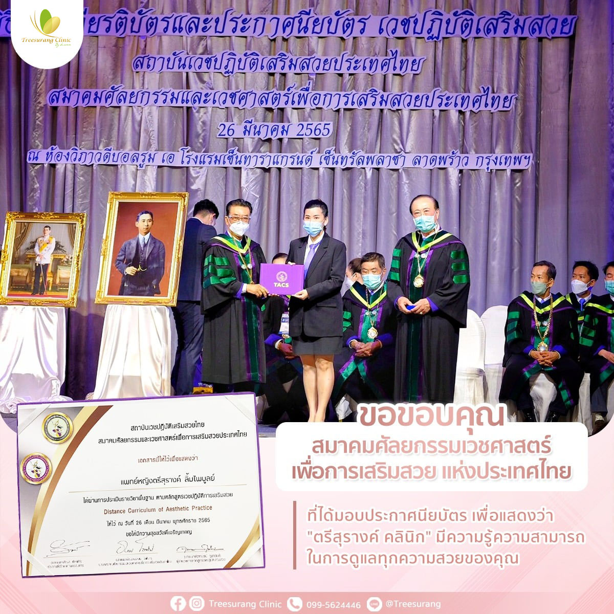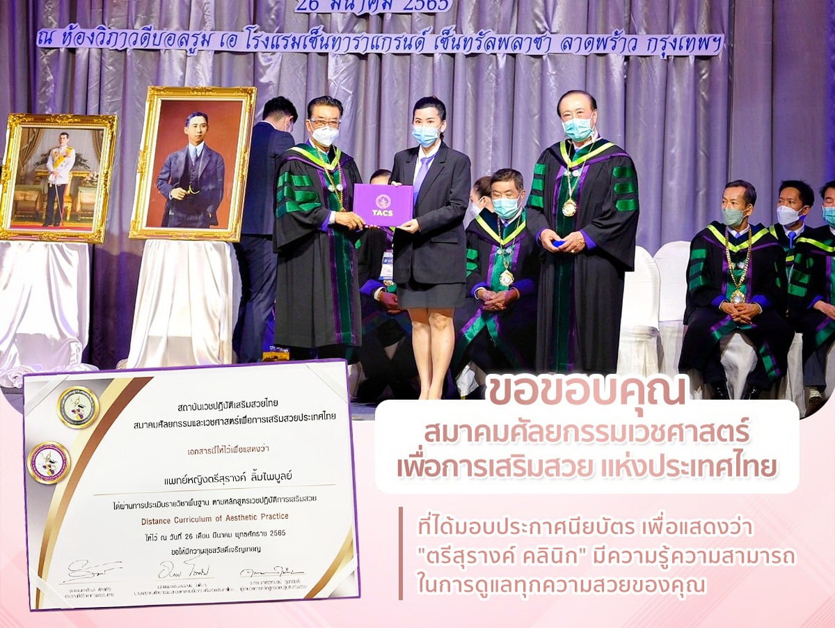 "ตรีสุรางค์ คลินิก" ขอขอบพระคุณ ทางสถาบันเวชปฏิบัติเสริมสวยประเทศไทย สมาคมศัลยกรรมและเวชศาสตร์เพื่อการเสริมสวยประเทศไทย เป็นอย่างยิ่งที่ให้เกียรติ โดยมอบประกาศนียบัตรฉบับนี้กับตรีสุรางค์ คลินิก เราขอสัญญาว่าจะรักษามาตรฐาน และพัฒนาฝีมือให้ดียิ่งๆ ขึ้น เพื่อดูแลทุกความสวยในทุกด้านของคุณ
