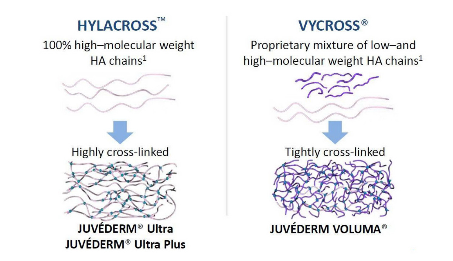 ฟิลเลอร์ Juvederm จะประกอบไปด้วย 2 เทคโนโลยีคือ Hylacross และ Vycross โดยจะมีคุณสมบัติที่แตกต่างกัน และในแต่ละเทคโนโยลีดังนี้